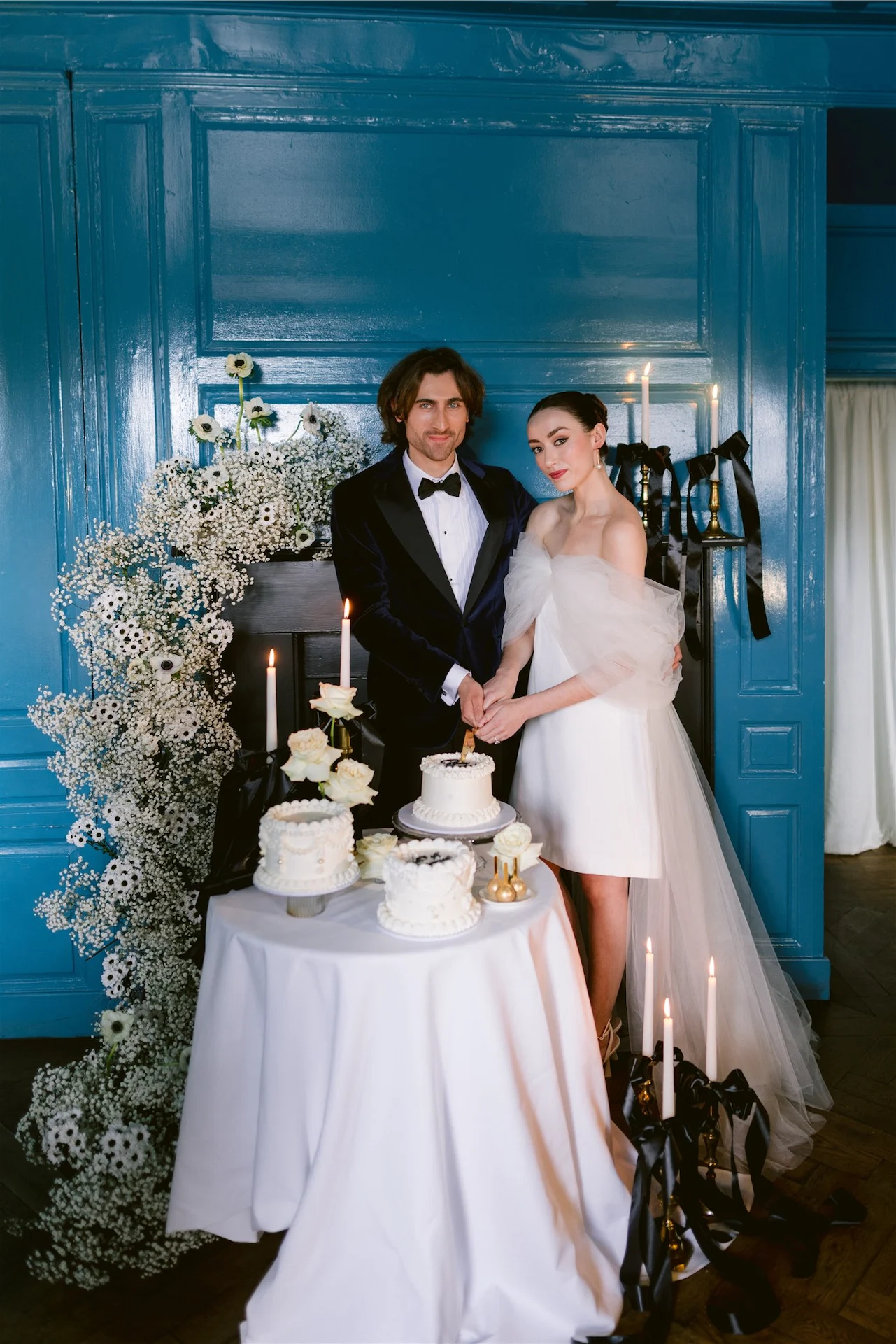 The bridal gowns are a study in contrasts, ranging from sleek and luxurious to modern and playful, each complemented by unique hairstyles that accentuate their individuality. Finally, the groom’s attire, whether a classic black tuxedo or a navy velvet jacket, adds a touch of timeless refinement to the ensemble.