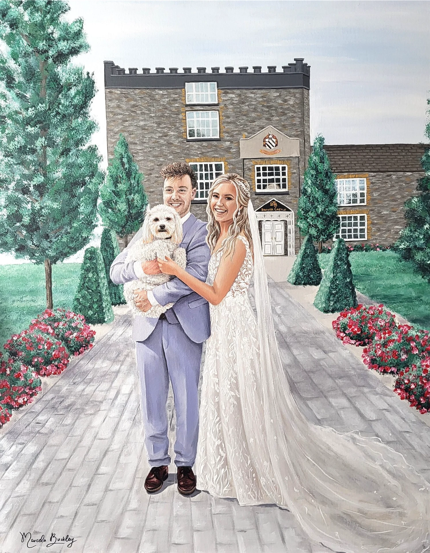 I also recommend it to couples because it allows them to add pets to their painting. I’ve found that, especially since Covid-19, pets are treated more like children. They’re such a big part of people’s lives, but more often than not, they can’t be at the wedding. So with painting, I can add them in from photos, making it that much more special. A big part of the whole experience is the guests too. I constantly have people looking over my shoulder and a lot of the night is spent talking to the guests about the painting, and with the bride and groom as well.