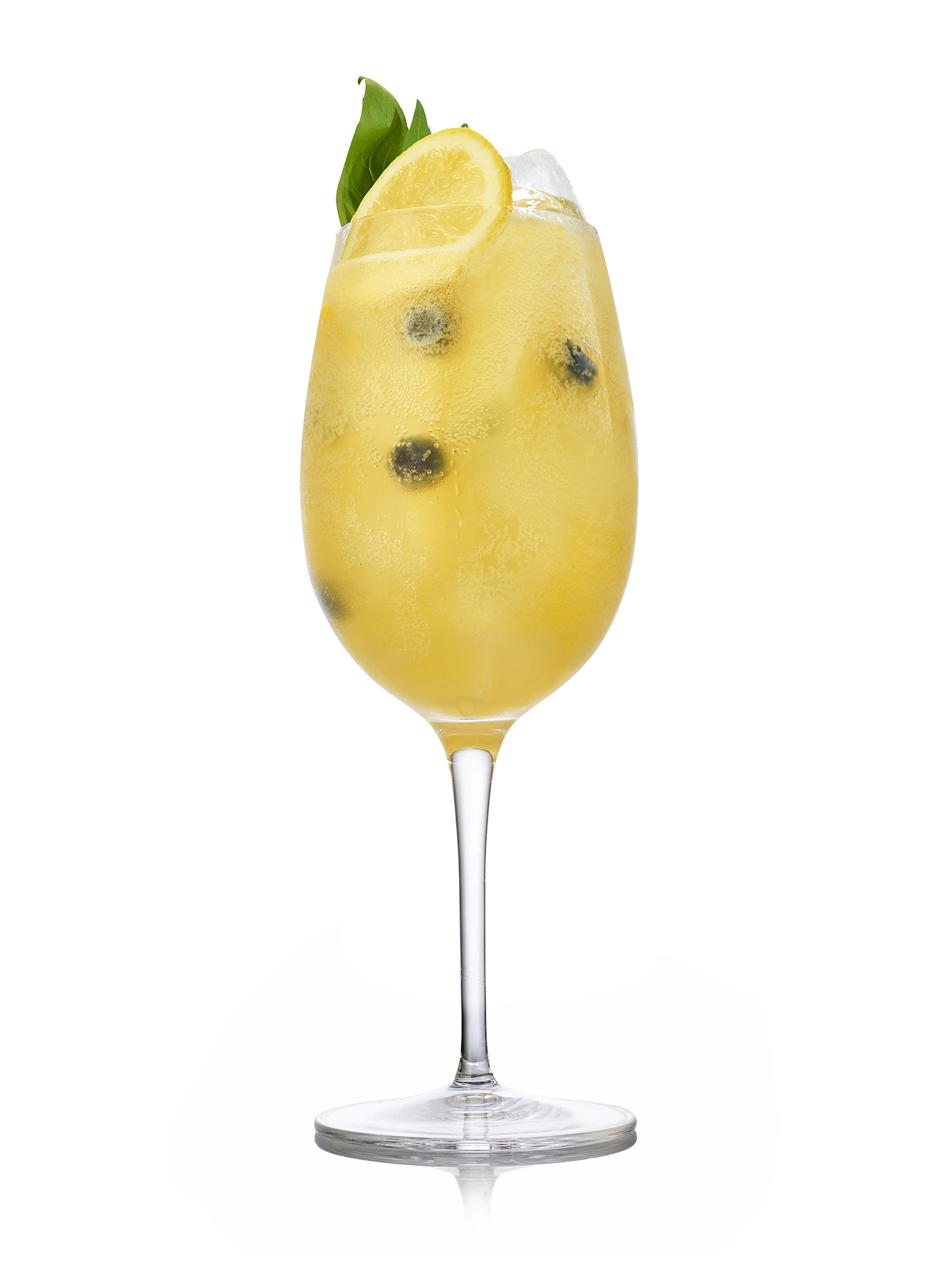 - Garnish with Blueberries, Lemon Wheel & Basil Sprig
